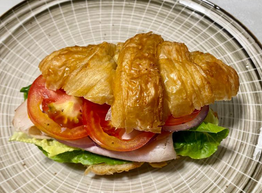 Flaky croissants filled with ham tomatoes, red onion and lettuce