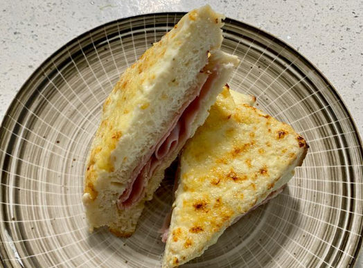 White bread,ham,gruyere, bechamel sauce and fried egg