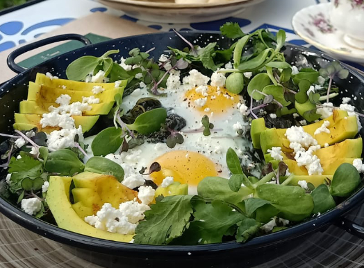 Sautéed spinach with poached eggs, feta cheese, avocado and coriander topped with microgreens