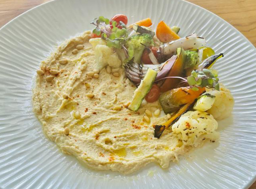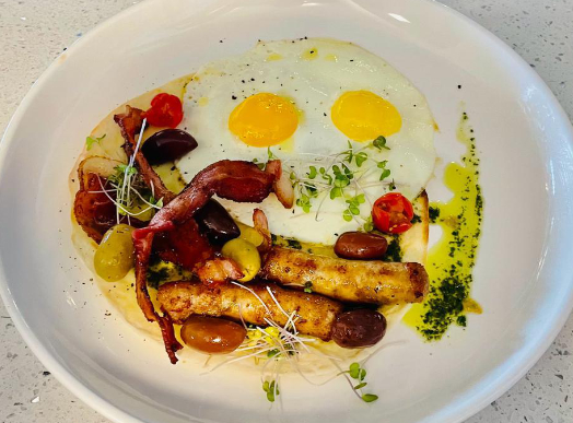 Bacon, fried eggs, breakfast sausage, olives, roasted cherry tomatoes topped with pesto sauce, served with pita bread